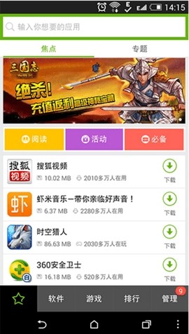 htc应用商店app在里面拥有很多好用的软件以及游戏资源等着我们去下载哦,里面的应用分类超级详细,所以我们可以直接在搜索栏之中去搜索需要的应用,并且所有的应用都是经过专业的检测和评测哦,所以我们在应用商店下载的时候丝毫不用担心哦,只需选择频道就可以下载对应的应用了,超级方便。